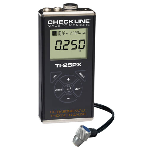 The Checkline TI-25PX Wall Thickness Gauge is designed for measuring wall thickness and the extent of corrosion on a wide range of materials. It is commonly used for checking the thickness of pipes, tanks, plates and other objects. It is designed and built to withstand harsh industrial conditions and is backed by a 5 year limited warranty.