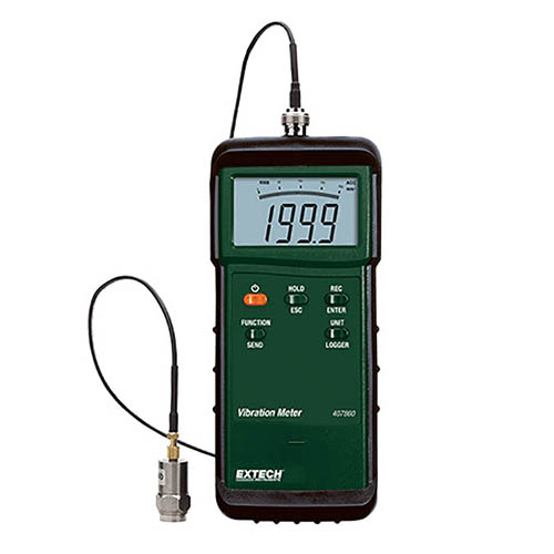 The Extech 407860 Heavy Duty Vibration Meter has a Velocity range of 7.87 in./s or 200 mm/s; Acceleration range of 656 ft./s or 200 m/s, and Displacement range of 0.078 in. or 2 mm. It features a basic accuracy of 5%, a remote vibration sensor (magnetic or stud mounted) with a 39 in. (1 m) cable, RMS, Peak Value measurement modes, and auto/manual store with recall of up to 500 readings. The captured readings can be downloaded to your PC for further analysis using the optional Windows compatible data logging software.