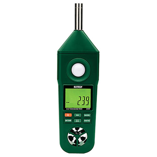 The Extech EN300 Measures Humidity, Temperature, Air Velocity, Light and Sound. Rugged 5-in-1 environmental meter with tripod mount and RS-232 PC interface. Large dual LCD simultaneous display of Temperature and Air Velocity or Relative Humidity. Characters on display reverse direction depending on Hygro-Thermo-Anemometer or Light-Sound Mode. Data Hold, Min/Max, Auto power off, Low Battery/Overrange indication. Built-in low friction vane wheel improves accuracy of air velocity in ft/min, MPH, m/s, km/h, and Knots. Built-in precision thin-film capacitance humidity sensor for fast response. Built in thermistor for ambient temperature measurements. Type K input measures temperature to 2372° (1300°C). Utilizes precision photo diode and correction filter for Cosine and color corrected light measurements. Sound Level measurement meets IEC 61672 class 2 using A frequency weighting and fast response time.
