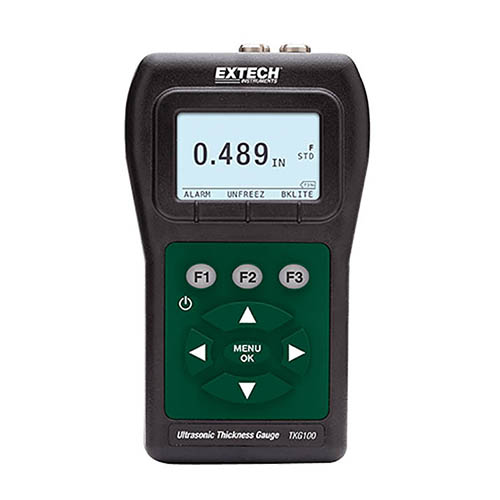 The Extech TKG100 is designed for making non-destructive measurements of wall thickness on steel structures, primarily. TKG-100 for monochrome thickness readout. All Models include 2oz bottle of couplant, 2 AA batteries, transducer with potted cable, and hard case.