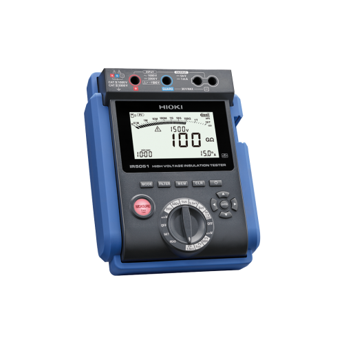 The IR5051 is a compact, lightweight, high-voltage insulation resistance tester capable of outputting up to 5 kV. Its unique measurement technology enables stable measurements of up to 10 TΩ. In addition, the IR5051 is capable of testing the insulation resistance of solar PV systems during power generation, and has a CAT III 2000 V safety rating to allow testing of 2000 V PV systems.