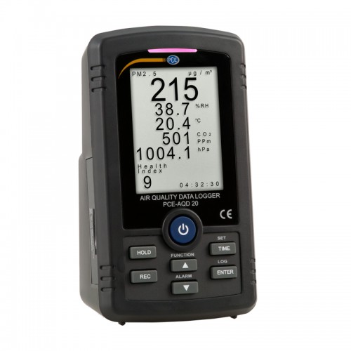 The air quality data logger PCE-AQD 20 is an ideal measuring device for monitoring the air quality at workplaces. The air quality data logger is ideal for continuous logging of air temperature, humidity, CO2, PM2.5 and air pressure. All these parameters give the occupational safety expert information about the air quality. The measured values are stored by the CO2 air quality data logger on an SD memory card.