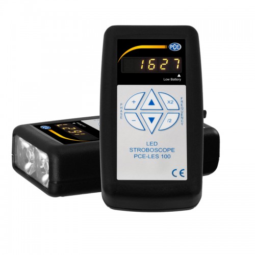The PCE-LES 100 LED Tachometer combines LED technology with compact and accurate electronics, which controls the sequence and timing of flash over the entire measuring range. Thanks to LED technology, the LED Tachometer does not need to periodically change the bulbs. The LED handheld stroboscope is ideal for non-contact measurements and to visualize movements on machinery and equipment, giving the viewer the impression that the object is stationary. The LED handheld stroboscope can be used for a variety of purposes, where it is important to make very fast movements visible (e.g. vibration), due to its wide frequency range and the different lengths of flash. Thanks to the compact design and size of the LED handheld stroboscope, you can always have it with you. The PCE-LES 100 LED handheld stroboscope is powered by two standard batteries (AA) included in the delivery.