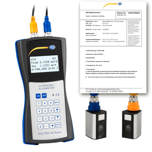 Each meter is assembled and calibrated by PCE Instruments in Germany. Therefore, a factory calibration certificate is provided by PCE Germany in the delivery contents of the meter. The certificate includes one measuring point on two different pipes. The reference display of the in-house test stand used by PCE for calibration has a valid DAkkS calibration certificate. This ensures traceability to the Physikalisch-Technische Bundesanstal (PTB) German national standard. Please note that because the meter's measured values depend upon the pipe geometry, material and coating; the medium type, temperature and speed; and the sensor type and measuring method, these parameters are listed on the supplied certificate for maximum traceability.