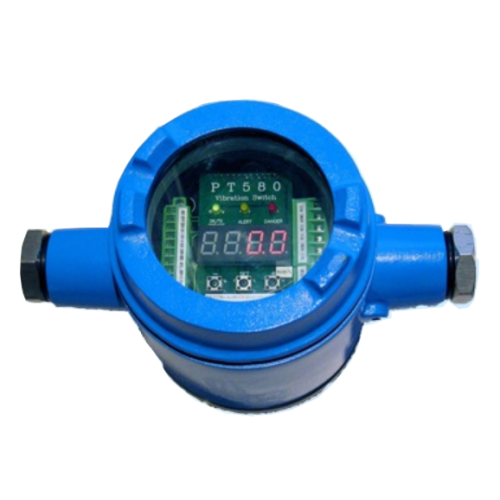 The PT580 Digital Vibration Switch is designed to be the “one stop shop” for all vibration switch applications. The PT580 is fully programmable, suitable for harsh environments and hazardous areas. It has a universal mounting feature, wide operating temperature range, dual alarms, 4-20mA output, Modbus communication, and works with an internal or a remote sensor.