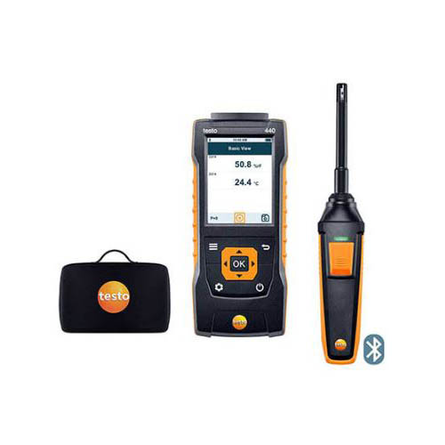 The 0563 4404 Bluetooth Humidity Kit includes the Testo 440 Air Velocity and IAQ Meter, which combines all the benefits of a compact handheld device with intuitive measurement menus and a comprehensive selection of air velocity and IAQ probes. This means you have all measuring tasks on air conditioning and ventilation systems reliably under control. You can connect the testo 440 to a large selection of digital probes, testo Smart Probes, or even many testo temperature probes, allowing for numerous configurations to meet your needs.The clearly structured menus for measuring volume flow in ducts and at outlets, cooling/heating load, K-factor, turbulence, mold indication and even a data logging mode are stored on the instrument for additional convenience. These menus enable you to accomplish your measuring tasks more quickly, more efficiently and more reliably than ever before. Reports can also be exported as excel files via the USB interface or printed out directly on site.